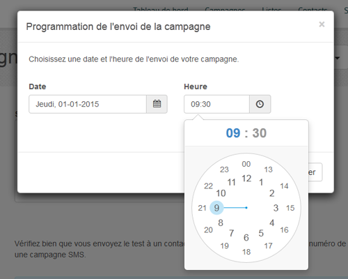 Définissez l'heure d'envoi de votre campagne SMS. Vous pouvez programmer l'envoi de vos sms à la minute près.